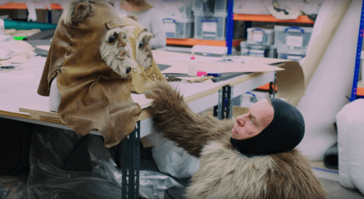 When he played Wicket in Return of the Jedi he was just a child, and the image included here is very clearly not from that. So this has to be taken from another instance of Davis playing Wicket, but he hasn’t played the character since 1985’s The Battle for Endor. In other words, here’s my point: we have never seen Davis as an adult portray Wicket, but the BTS reel clearly shows an adult Warwick Davis in the Wicket costume.