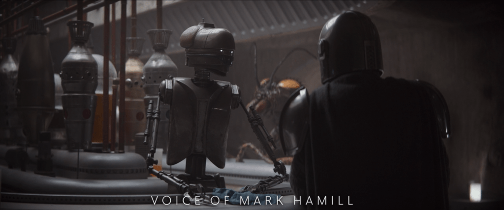 In the fifth episode of The Mandalorian, we return to Tatooine for the first time since Return of the Jedi (in-universe, that is), and we see the Mos Eisley Cantina for the first time since A New Hope. It’s changed a bit, specifically because droids are not only allowed now but are actually running the place! There’s a bartender droid whom Djarin speaks with looking for work – and we learn in this episode of Disney Gallery that we’ve actually seen that droid before! It is EV-9D9, who was the droid seen in Jabba’s Palace in ROTJ, overseeing the reprogramming of droids. She’s the one who assigned R2-D2 to Jabba’s Sail Barge, and C-3PO to be Jabba’s interpreter droid. Now, five years later, she is actually bartending at this Cantina! And as an extra fun fact, it was revealed in this episode that Mark Hamill actually voiced EV-9D9 in her brief appearance on The Mandalorian! There’s another droid we’ve seen before that appears even more briefly in the Cantina, and this episode confirmed that it is in fact R5-D4! This was the droid first purchased by Owen Lars from the Jawas in A New Hope, but due to a bad motivator, led the way to R2-D2 being bought by Lars and his nephew, Luke Skywalker. Filoni mentioned that he’s always thought of R5 never leaving the planet, and so Filoni brought the droid into this episode – even going so far as to tell the props people to scuff him up have oil residue where he blew his motivator.
