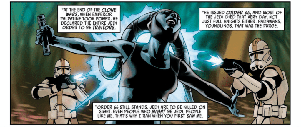 (2) The second thing was even more significant, I think. In this issue, we see Luke learn about Order 66 and the Inquisitorius for the very first time! Star Wars fans are obviously familiar with all of that, since Order 66 was seen in Revenge of the Sith and The Clone Wars, and then the Inquisitorius in Rebels and Fallen Order. But Luke learns about it for the first time here, which feels quite important. Verla rightly points out to Luke that he has only heard about some of the positives of being a Jedi but hasn’t heard about the horrors that have happened to them. In the years following Return of the Jedi, Luke spent a lot of time traveling the galaxy and learning about the history of the Jedi, the Sith, and the Force, but this is all happening before that. And so of course Luke wouldn’t know much about what happened to the Jedi… until now. I’ll be very curious to see how he deals with this latest piece of information, as it feels like everything Luke thought he knew about the Jedi – both his father and the rest of the Jedi – is being shaken. It’s pretty cool to see Luke learning about this, since we’ve seen it happen, and it thus feels like a pretty significant moment.