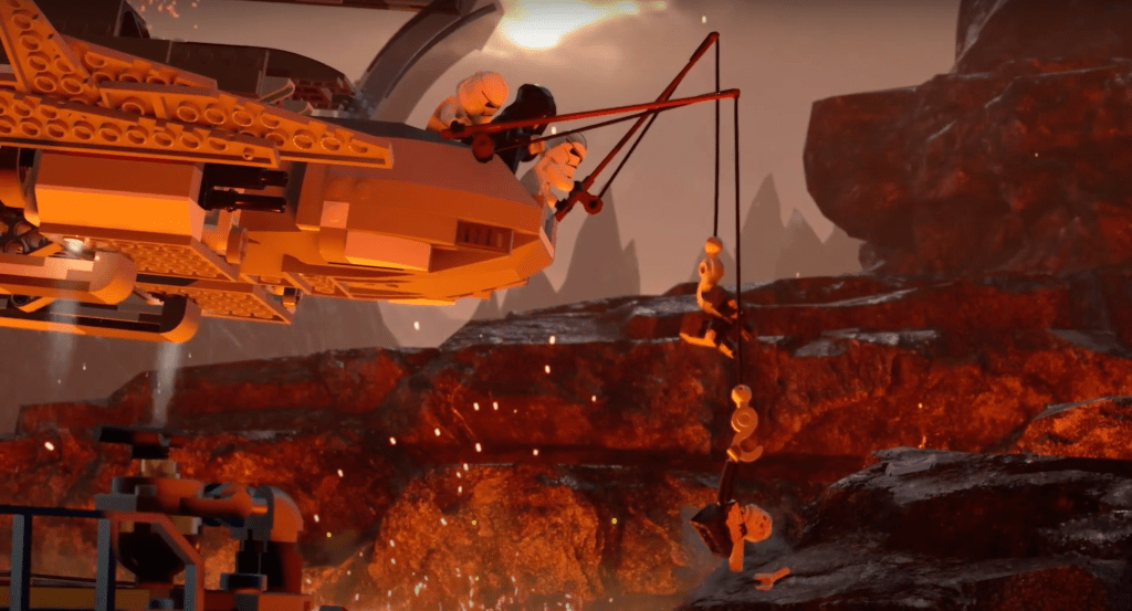 Not even Anakin Skywalker’s lowest moment is exempt from LEGO humor. After losing to Obi-Wan Kenobi in a duel on Mustafar and being left for dead, Anakin is helpless – and that’s when Palpatine finds him, just like in Revenge of the Sith. But this time, Palpatine watches by from his ship while his clone troopers use a fishing pole to reel in Anakin.