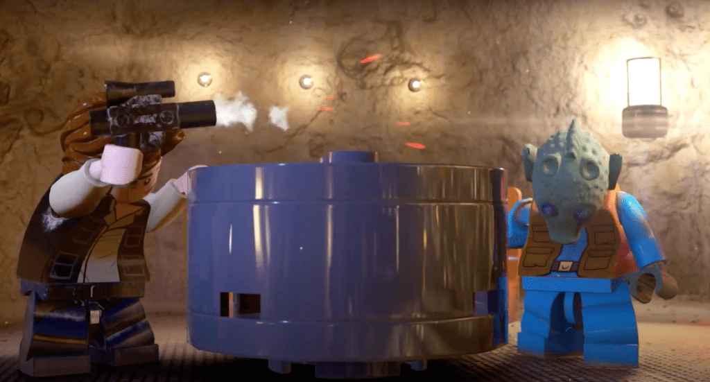 You might be familiar with the whole “Han shot first” debate, and that scene gets the LEGO treatment here. While it doesn’t seem like they’re out necessarily to settle the debate, they do provide a bit of a humorous twist to this moment, as Han and Greedo exchange shots at each other while ducking under the table to avoid the opponent’s blasterfire. And yes, Han shoots first in this trailer, by the way.