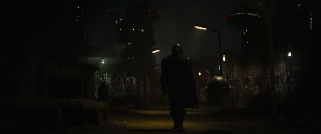 Next up is Mando and the Child approaching a city at night. I’m not really sure where this is, but I definitely love the cinematography of these shots. So great.