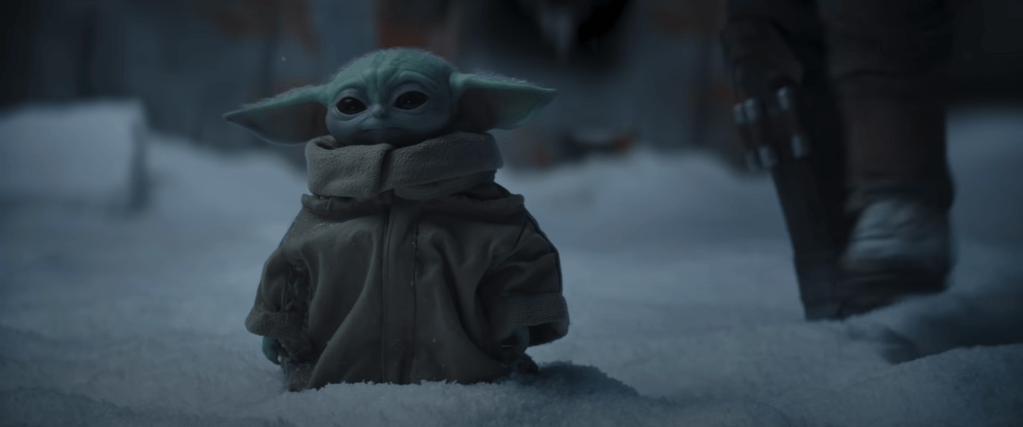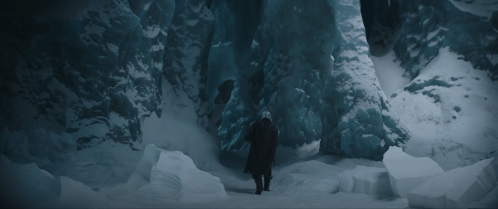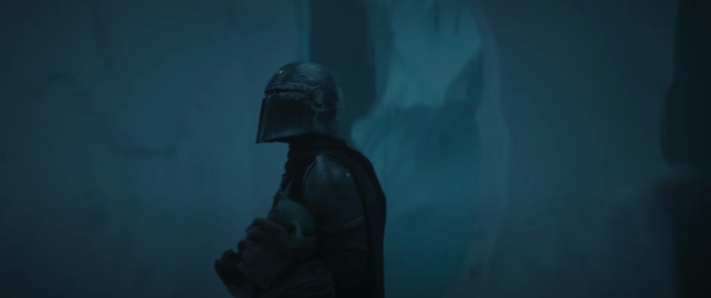 Ok, so I kept mentioning that I have a crazy guess as to what the snow planet is, and here we go: I wonder if it’s Ilum. I saved it until this shot because this is the one that really made me wonder if this might be Ilum, as Djarin carries the Child into this ice cave. But the previous shots also would support such a guess. There are a couple of additional reasons why this would make a lot of sense. Firstly, Djarin’s quest seems to be to find Jedi to return the Child to. But Jedi aren’t exactly running around all over the place at this point, so it seems he’ll have to try to track them down. If he gets a tip about Ilum, of course it makes sense to check it out, since this was such a sacred sight for the Jedi. So thematically, it would work. But secondly, series creator and showrunner Jon Favreau has hinted that this show will connect to the First Order in some way. Before the series even premiered last fall, he hinted at that in an interview with Entertainment Weekly. We’ve been very curious since then about how this could tie in, but here lies a perfect opportunity. The Empire mined Ilum for kyber crystals, and the First Order eventually picked up on that and turned the planet into Starkiller Base. So at this point in the timeline, Ilum would be disfigured and damaged from the Imperial mining, but likely still very much explorable for Djarin, especially since the Empire has fallen.
