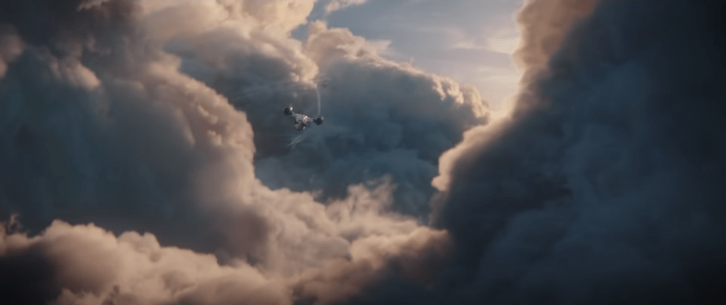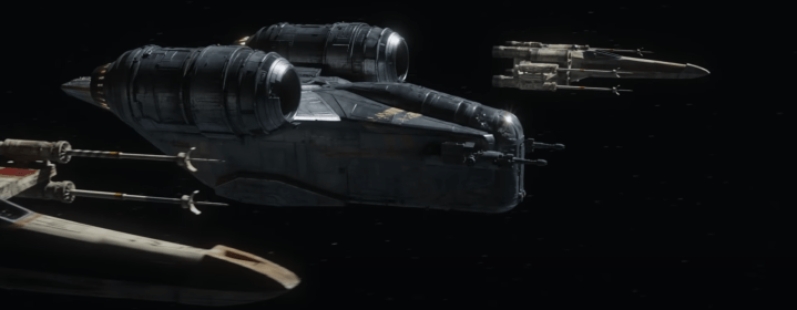 These shots probably made me the most excited of any in the trailer, however: the Razor Crest flies alongside New Republic X-Wings! We first see it in space, but then in a simply gorgeous shot we see the ships zooming through a cloudy atmosphere, following one another. The cinematography of this is so incredible. Notably, as Djarin looks out his cockpit window at one of the fighters, and the X-Wing locks its S-foils in attack position, the shot cuts away before we can get a focused look at who is in the cockpit.