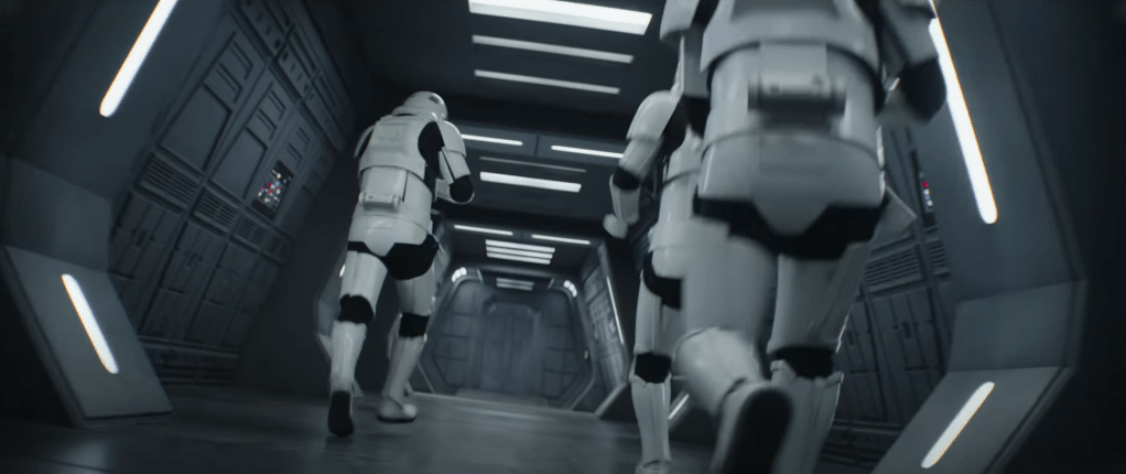 We see stormtroopers running through a hallway. Without any context here, it’s impossible to tell what’s going on. Is this on Moff Gideon’s ship? On Nevarro? Somewhere else?