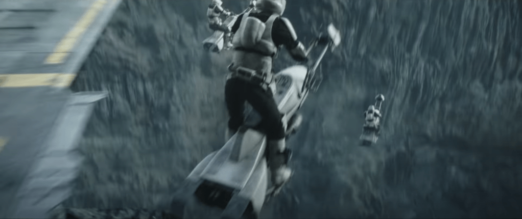This looks to be on Nevarro still, and it looks absolutely incredible. Scout Troopers ride their bikes off of a platform, free-falling down to the planet’s surface, where they don’t seem to miss a stride and keep riding their bikes through the ridge here.