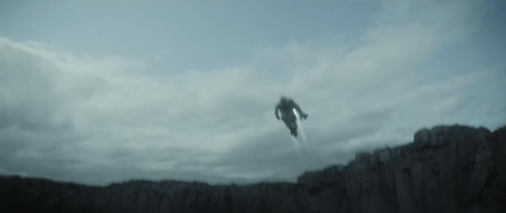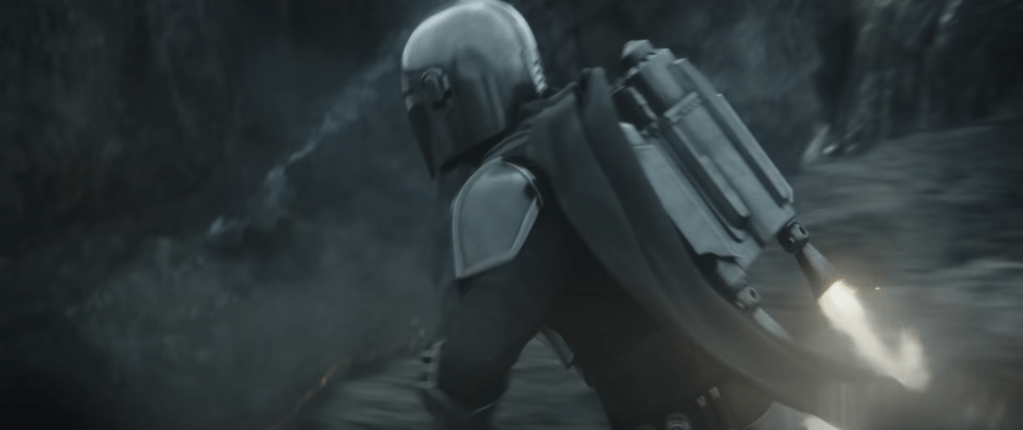 Mando’s got his jetpack! It looks like this is in a similar location as the one where the Scout Troopers ride their bikes along the ridge on Nevarro, so I wonder if it’s part of the same sequence. Mando gets a running start and then powers his jetpack, flying across the chasm. But is he attempting to fight the Scout Troopers or flee from them?