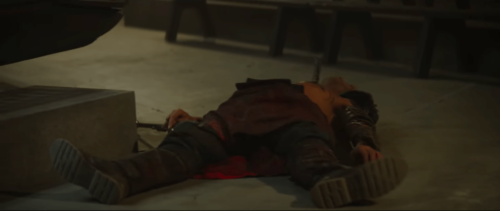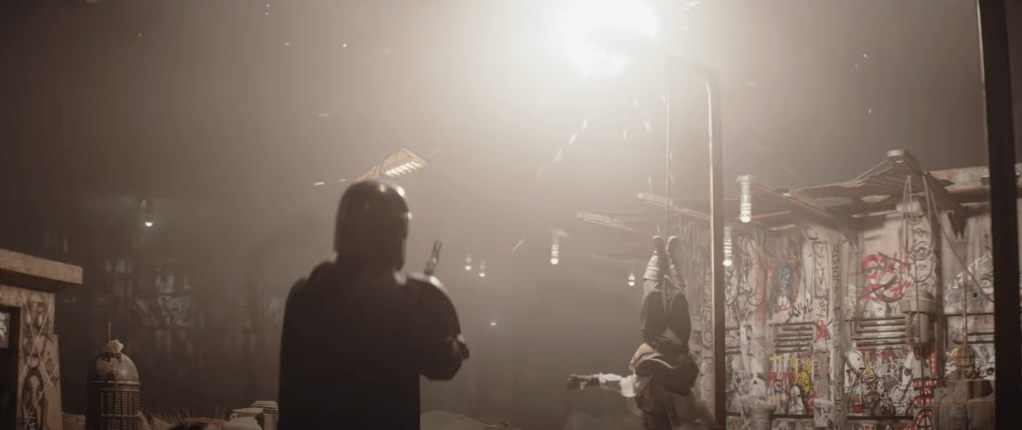It looks here like we’re back on that planet seen early in the trailer, as it’s a city at night. Someone is strung upside down attached to a pole, and Mando shoots at it – it looks to me like he might be trying to free the person, but I’m not sure.
