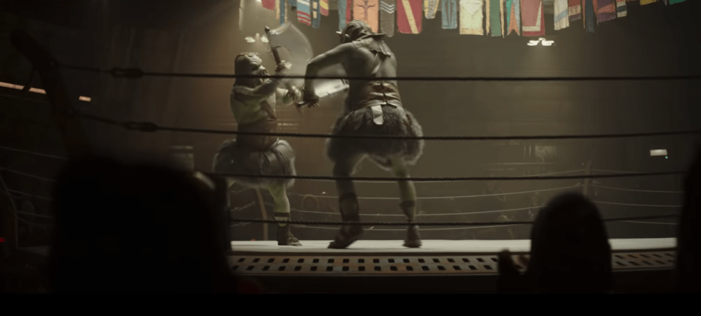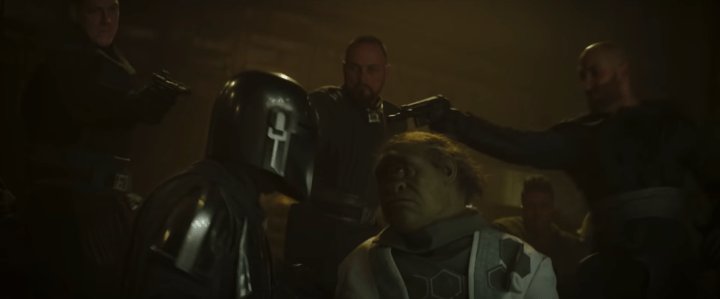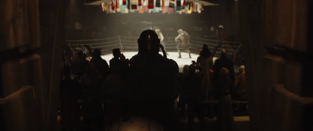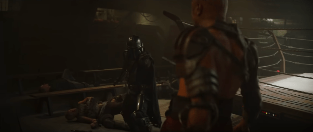 I’ve got nothing to base it on, but my guess is that this location is somewhere on the dark city planet we’ve seen already, and Mando walks into an arena where two Gamorreans are fighting. The first ever glimpse of season two we got was when Jon Favreau posted a picture of a Gamorrean on social media, and here they are! Two of them are in the ring facing off against each other. Meanwhile, an Abyssin stands by Djarin watching the fight. We first hear a voiceover of him saying, “You know this is no place for a child.” Djarin responds, “Wherever I go, he goes.” To this, we see the Abyssin say, “So I’ve heard,” and he and several others all pull their guns on Mando in an instant. He’s in trouble…