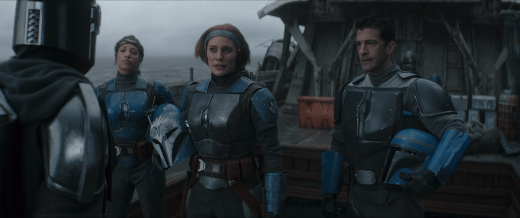 But I think a lot of what is happening so far this season is challenging Djarin’s perception of what a Mandalorian really is. In the first episode, though Cobb Vanth isn’t a Mandalorian, it seems that Djarin comes to trust and respect him. So perhaps being a Mandalorian is about more than just the armor? Then in the second episode, the frog lady challenges Djarin on the Mandalorian ways, saying they must keep their word. Then, at the end of the episode, the encounter with the New Republic officers reinforces the idea that doing the right thing is important. So perhaps being a Mandalorian is about honoring your word and trying to help others? Then in this episode, Bo-Katan and the others remove their helmets, but Djarin comes to partner with them and work together. So perhaps being a Mandalorian is about more than wearing a helmet? Djarin is learning what it really means to be a Mandalorian and is being confronted by that on a regular basis, so I’m guessing we’ll see all of that continue to grow and develop as the season goes on.