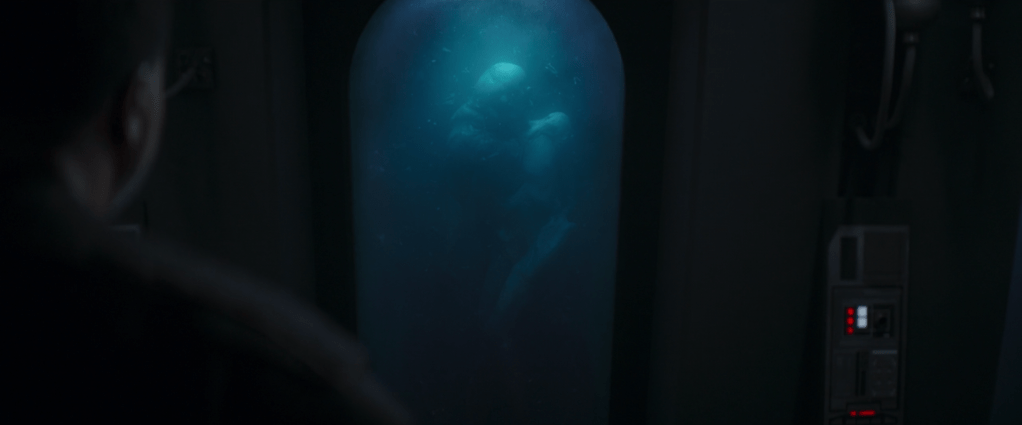 Ok, now we arrive at what you’ve been waiting for. The moment in the episode that massively raised the stakes for not just this chapter but the whole season and the whole show came as the heroes discovered that this Imperial facility was actually a lab. They come across some vats of experiments and a message from Doctor Pershing (who, remember, bears the Kaminoan cloning logo on his uniform…). He discusses needing needing a blood donor with a high “M-count,” which is obviously a reference to a high Midi-chlorian count. He doesn’t believe they’ll find a donor with as high of a count as the Child, but he was only able to extract a small sample from the Child, which has been used up. The experiments they are running are some sort of blood transfusions, but the subjects have thus far rejected the blood.