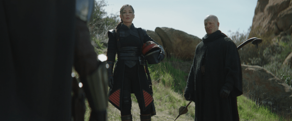 Since he cannot retrieve Grogu and escape, Djarin heads off to confront the strangers, intent on buying the Child time. Before long, however, Boba Fett approaches Djarin, saying that he’s not after the Child but the armor – his armor. He then reveals that Fennec Shand is perched with her sniper aimed at the kid, if Mando doesn’t comply. He agrees, removing his jet pack, while Fett and Shand lower their weapons. Fett says that if Djarin gives him the armor that he retrieved from Cobb Vanth, then Fett and Shand will ensure the Child’s protection.