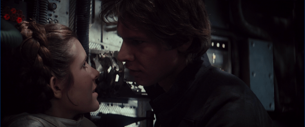 But this is actually apparent from their very first scene together. The two of them fight quite a bit, but the music and a bit of intuition betrays the words they speak: these are two people falling in love with one another. On Echo Base, Han taunts Leia by saying that she wants him to stay because of the way she feels about him, and so even though the two of them are trying to deny it, they both know it to be true. But their fighting and banter also leads to some great line throughout the film, like: