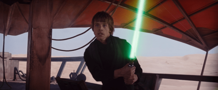 So they’re taken above the sarlaac pit, and Luke demands that Jabba either free them or die. Jabba orders for Skywalker to be thrust into the pit, but Luke gives a salute to R2-D2, perched atop Jabba’s Sail Barge. As Luke leaps off the plank toward the pit, he suddenly spins, catches the plank, and flips himself into the air, all the while R2 launches Luke’s lightsaber high into the air. Luke lands on the skiff, catches the lightsaber in his hand, and ignites it – a GREEN lightsaber (the first time a lightsaber in the franchise wasn’t blue or red)! He then begins furiously fending off Jabba’s men, and the thrilling battle is on.