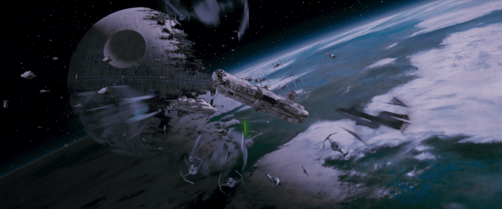 So the battle ensues across the three fields: Han, Leia, Chewie, and their team of Rebels and Ewoks fight on the forest moon to try to deactivate the shield. At the same time, Lando and the Rebel fleet faces the Imperial fleet – and a Death Star that is surprisingly operational. And meanwhile, Luke faces Vader, and then the Emperor. The three of these encounters going on at the same time really adds to the experience and it feels like the massive battle sequence that we’d been waiting for.