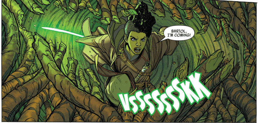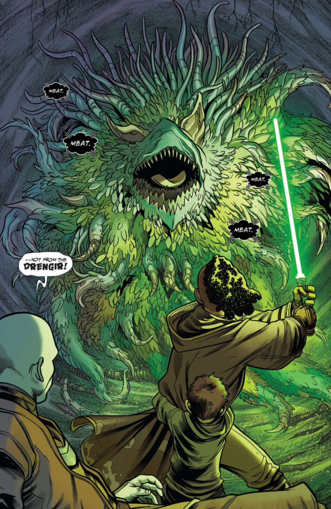 I suppose we should now move on to the Drengir, which is revealed to be the culprit behind the disappearances. In case you’re unfamiliar with the Drengir, they were introduced in Into the Dark, and they are a species of sentient, carnivorous plants strong with the dark side of the Force. They are able to control and eat any meat, and they represent a formidable foe for the Jedi. In Into the Dark they take the Jedi Dez Rydan, and here they take Ceret (and then Sskeer). They are not to be taken lightly, and as we’ve seen in both Into the Dark and this issue, they are very hard to kill, because they are able to regenerate and heal very quickly. When we saw the tentacle arm appear from the field right before Ceret disappeared in the last issue, we suspected the Drengir – and now it’s confirmed. One cool aspect of this is that this issue gave us some new illustrations of the Drengir, helping us to better visualize them. But we don’t know how they got to this planet, nor do we know how the Jedi will defeat them.