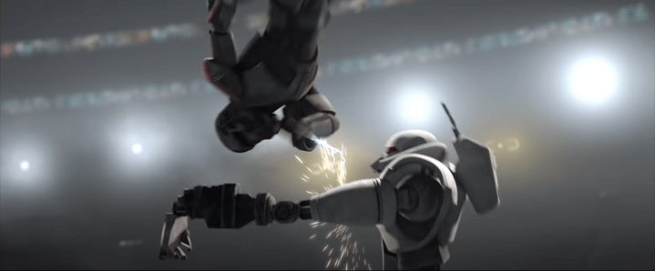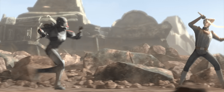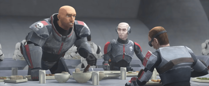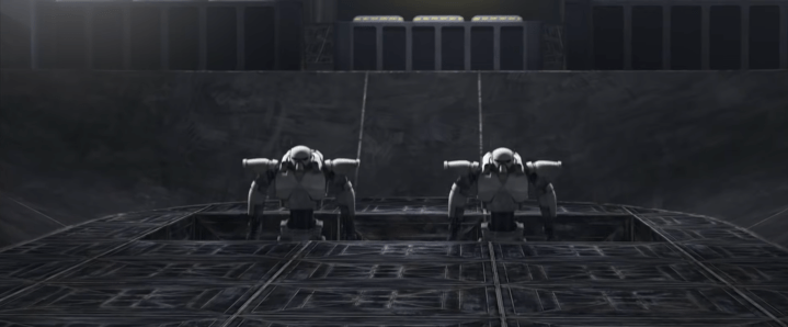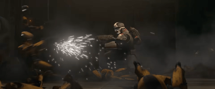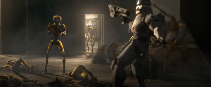 After Wrecker’s antics of rushing ahead and fighting the droids himself, he shouts out toward Tarkin, “What else you got? Give me more!” We also get a shot of the squad regrouped, so they all spring into action at some point. Tarkin doesn’t look too pleased – presumably, as already mentioned, by the lack of uniformity.