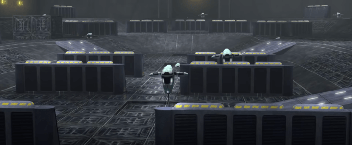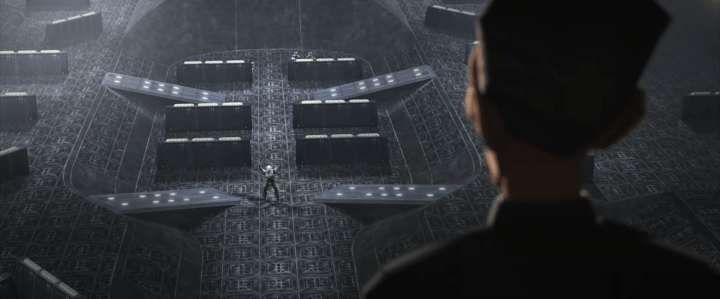 There are a number of very quick glimpses at the Bad Batch approaching the training arena, facing off against training droids, and taking them out one-by-one – led, of course, by Wrecker’s eager antics. This goes to demonstrate what Tarkin is saying: they are a great squad, but don’t play it by the book.