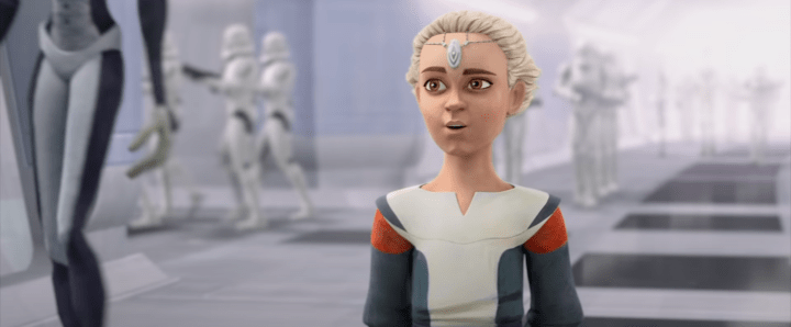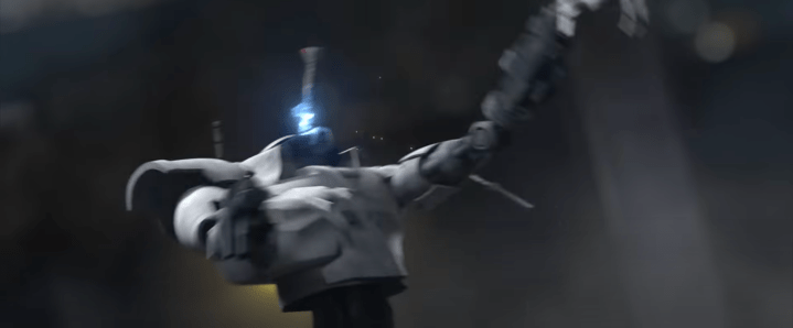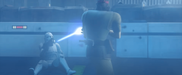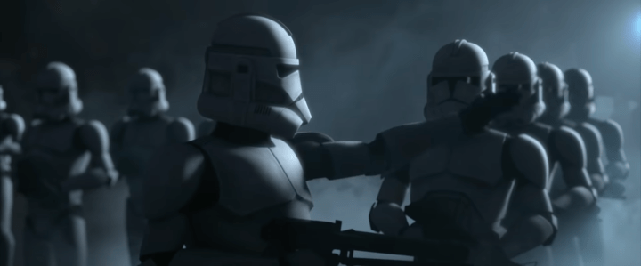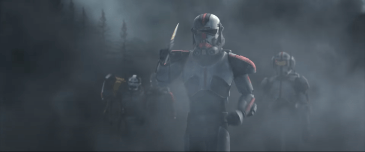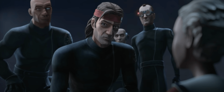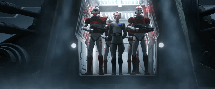 We get more of Tarkin, including him arriving to Kamino accompanied by the Coruscant Guard, and then we cut to him saying, “I want clone force 99 found and wiped out.” It appears that the clone troopers are ordered to hunt down clone force 99, who go on the run from the Empire. What we don’t know is what leads to this happening, though I suspect that all of this will be the impetus for the events of the series – the squad finds no home in the Empire and is forced to go on the run and try to chart their new place in the changing galaxy.