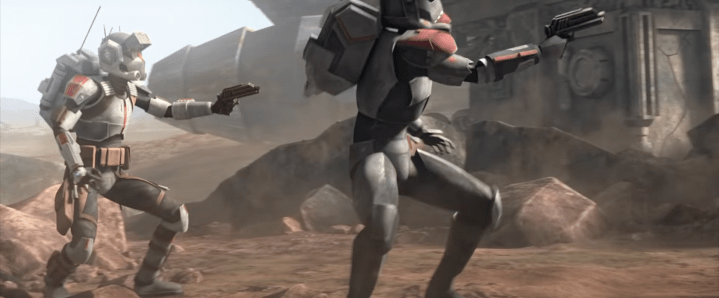 HUNTER. We see Hunter again without his clone trooper armor (though Echo has his), and he’s fighting clone troopers. So this really helps us place things, as this is after the Empire begins to hunt the Bad Batch. Hunter here actually shoots clone troopers, which I hope is given some room in the show – I’d be interested in seeing how clones process killing their “brothers” – or if the Bad Batch really even considers these “regs” to be their brothers at all. I hope the show will explore the characters’ emotions and reactions to all of this.
