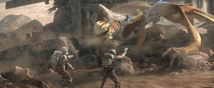 As an illustration of Fennec’s point, we see the Bad Batch encountering a giant lizard creature – which looks to be a brezak. This planet also seems to be featured quite a bit in the trailer, and it seems to me like it’s Zygerria. We see the brezak here, and later we see a Zygerrian slaver on the same world – so that’s definitely my guess as to what planet this is.