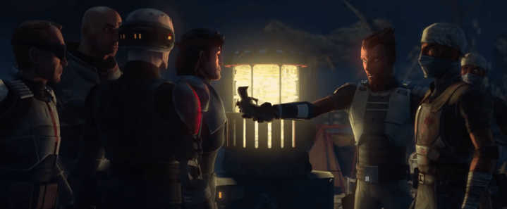 Another familiar character shows up: Saw Gerrera! Having appeared already in The Clone Wars, Rebels, and Rogue One, we’ll get to see Gerrera shortly after the end of the Clone Wars here, and maybe we’ll find out more about what happened at Onderon. He tells the Bad Batch, “The Clone Wars have ended. You can either adapt and survive, or die with the past. The decision is yours.” In many ways, that seems like the summary and premise of the show.