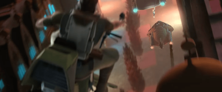 So I’m thinking that this battle sequence might actually be the opening of the show. Perhaps the Bad Batch is fighting alongside other clone forces on this planet in the final moments of the Clone Wars, and that’s when Order 66 happens. This then might lead to many clones being brought back to Kamino to await further instructions, but Tarkin wants to put this special group – who I’m speculating doesn’t execute Order 66 – to the test. All of this is just a guess… but I’m thinking that these shots actually take place prior to the regular events of the series.