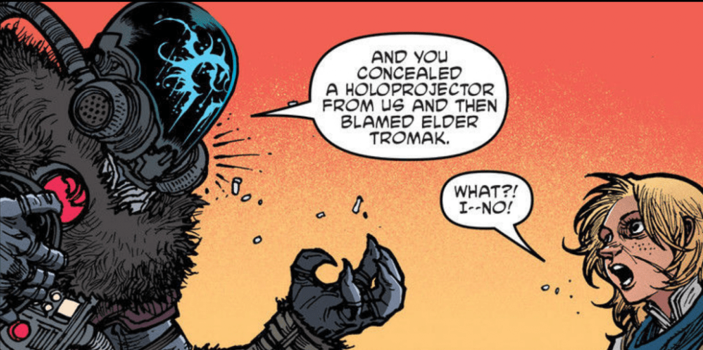 I also need to mention how Krix is less and less of the innocent kid taken advantage of by the Nihil; he’s still that, but we are also learning that he’ll do whatever it takes to preserve his own wellbeing. That’s contrasted in this issue with Tromak, the elder, who selflessly volunteers for the role in the Battle Rink that he knows will lead to death… and only moments later, Krix lies and blames Tromak for the transponder, which gets the elder killed. Krix is only out for himself – he doesn’t care about the impact on others.
