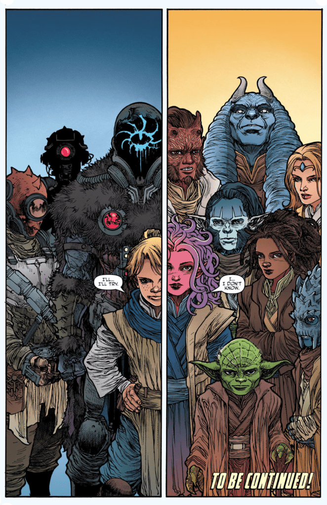 But at the same time, it’s no coincidence that this issue ends with a split-page, with both Zeen Mrala and Krix Kamerat put in an identical position: recruited to help find the other side with the transponder. Krix appears more readily willing to help than Zeen does, but both the storytelling and especially the artwork drives us to see that both the Jedi and the Nihil are placing these young kids, who have just lost everything, in the same spot. The Jedi are nicer and more understanding as they go about it, but it’s still notable that both sides are seeking to take advantage of the newcomer’s relationships to their own ends.