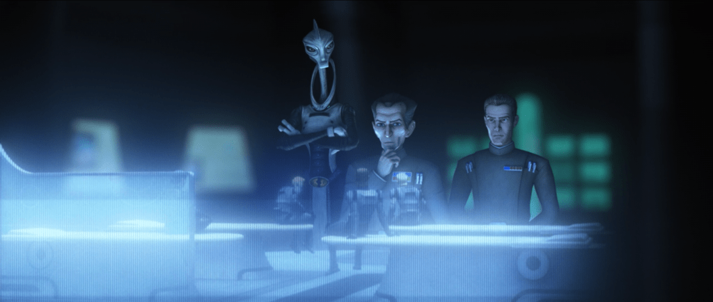 While those events are going on, the lost member of the crew, Crosshair, is still on Kamino. An Imperial officer named Rampart approaches Tarkin about Project War Mantle, the beginning of conscripted recruits for the Empire. He presents the first four of them, and the humans will be trained by Crosshair into an elite squadron – much to the chagrin of Lama Su, who tries to persuade them against replacing the clones. In order to test their loyalty and effectiveness, Tarkin sends the new sqaud to Onderon to eliminate Saw Gerrera and his band of rebels – the same mission that Clone Force 99 had previously declined to follow through with. As they arrive, one of the recruits openly questions Crosshair and wonders why he’s the leader – and insists he won’t be for long. We quickly realize that this encounter will be different from the previous one on Onderon, as the squad comes in hot, firing on the rebels and killing many of them. Crosshair executes one of the survivors almost immediately upon realizing that they wouldn’t tell him anything, and he orders the refugees killed. The vocal recruit defies him and says that they won’t do it. Crosshair then reveals why he’s in charge – because he’ll follow through. He kills the recruit, telling the others that “Good soldiers follow orders.” He then orders them to kill the refugees, which they (reluctantly) do. Back on Kamino, Tarkin is impressed with the results and promotes Rampart to Admiral, appointing him overseer of the project.