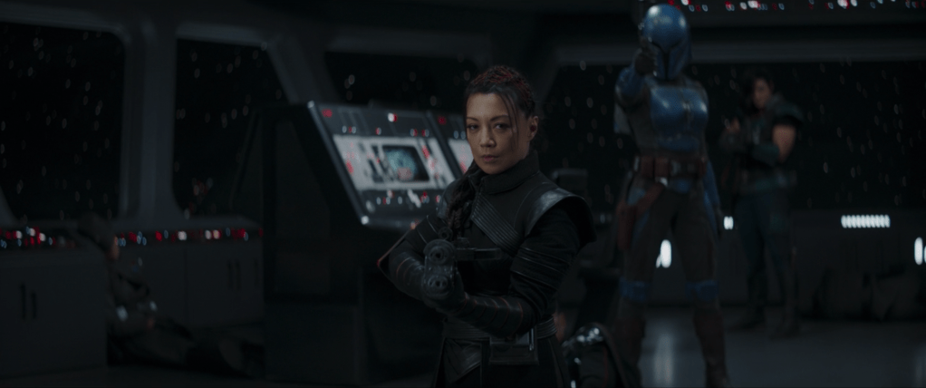 Since Fett got his armor back, he and Shand pledged Djarin that nothing would harm the Child, so together they launched a rescue effort. This first took them to Morak, where Djarin learned the location of Moff Gideon’s cruiser. As Djarin and Mayfeld, an old convict, escaped the Imperial facility, Shand and Cara Dune (who had agreed to join them once she learned the Child was in danger) served as snipers providing cover. Next, the group enlisted the help of Mandalorians Bo-Katan Kryze and Koska Reeves. A strike team of Djarin, Kryze, Reeves, Shand, and Dune infiltrated Gideon’s cruiser, rescuing the Child, defeating stormtroopers, and capturing Gideon. But they were then rescued themselves by the Jedi Luke Skywalker, who showed up to turn the tide of the battle and take the Child.