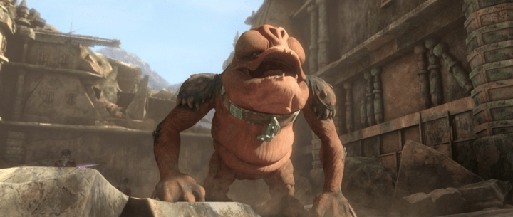 Well, as we should expect, things are never as simple as they appear, and that’s what the Bad Batch comes to learn. And, they also learn that the kid they’ve been tasked with retrieving, named Muchi, is actually a baby Rancor! And as if that weren’t enough, the person who wants the Rancor is Bib Fortuna, Jabba the Hutt’s right-hand man, who shows up at the end of the episode accompanied by a couple of Gamorrean Guards.
