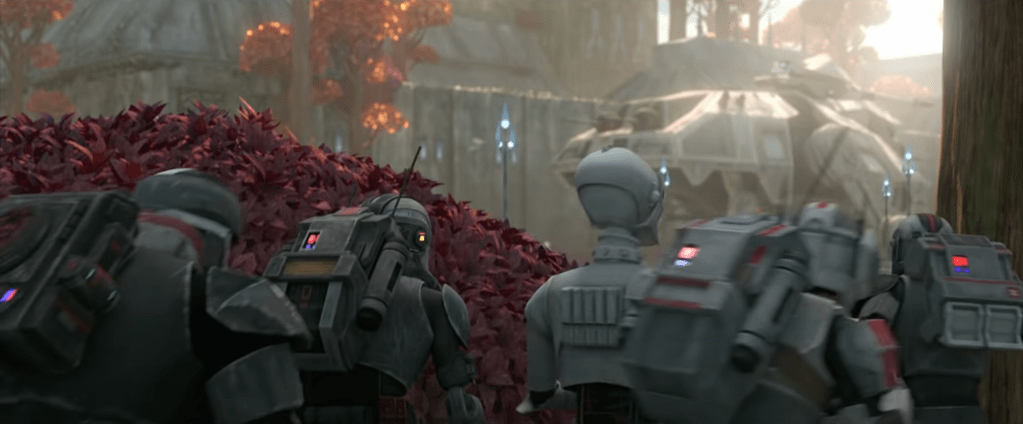 It’s not just Imperial clones that are sent to the planet, however, as the Bad Batch shows up there as well. We knew that, of course, but we get a couple of new shots in this trailer of them on the planet I assume to be Raxus. They’re accompanied by a protocol droid that looks to be the same model as AP-5 in Rebels. But also note that Omega is nowhere to be found, which leads me to believe that this takes place before the squad rescues her? So perhaps this will be happening very soon, and I would assume that means there’s a key reason for the Bad Batch going to Raxus that ties into everything with Omega.