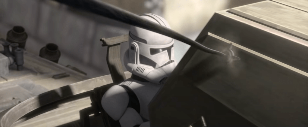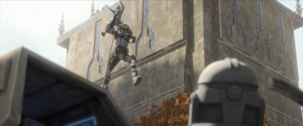 Additionally, we see Tech and Echo sliding down a grappling line toward a clone in one of the walkers, with Tech shooting at him and stunning him. I’m guessing this is the Bad Batch trying to take control of one of the walkers, and it’s a pretty cool shot.