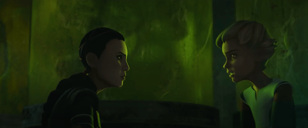 These shots, however, are by far the most interesting in the trailer. Fennec Shand shows back up, and she’s looking at a mysterious green tank of sorts… which falls and breaks open on her, and it looks like there’s a figure inside that begins to fall out. But we don’t get any clear glimpses of this. So there’s a lot of unknowns still, but we do get one concrete bit of information: Fennec Shand will show back up! And given the uptick in interviews with Ming-Na Wen recently and coming up, it seems that Fennec may have a much bigger part to play in the second half of the season. If I had to guess, I think she’ll hunt Omega wanting the bounty for herself. Along the way, however, I wouldn’t be surprised if she comes to appreciate the kid and actually works to protect her rather than harm her. Since Fennec will be starring in The Book of Boba Fett I wouldn’t be surprised if she gets established as a sort of hero, much like she was portrayed in the second season of The Mandalorian. She’s obviously not exactly a ‘good’ person, given her history, but I nonetheless wouldn’t be surprised if she’s portrayed as likable here for fans.