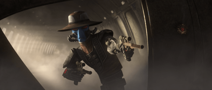 The other thing to note in the episode is that it was great seeing Cad Bane and Fennec Shand engage in several fights. Bane is obviously probably still the best in the galaxy at this point, but Fennec – the newcomer – more than holds her own. When Bane’s hat is off in this episode we can see the cybernetic plate of sorts on his head, which appeared in the concept art of last episode and seems to strongly indicate that his duel with Boba Fett has already happened. If that’s the case, then we’re probably seeing Bane’s hold on his place of prominence slowly slip away. He’s been badly injured by this young kid in a duel, and others have surely heard about that, and now in this episode the newcomer Fennec ensures that Bane’s bounty gets away. He’s still a force to be reckoned with and is a deadly bounty hunter, but I’m wondering if this series will explore any of that. I’m hoping that Bane shows up again soon! He steals the show in every scene he’s in, and the fights with Fennec were brilliantly done. They were fast-paced, fresh, and exciting, with both bounty hunters getting the upper hand at times.
