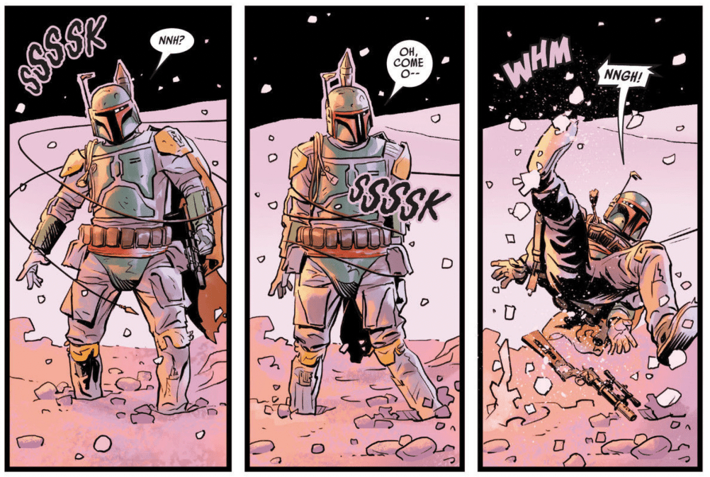 Darth Vader shows up, saying that Captain Solo belongs to him. As he watches this unfold, Boba Fett responds to himself, “We’ll see.”