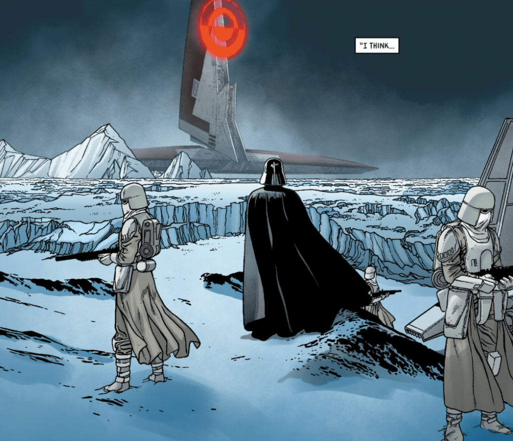 Later, as Luke approaches Jekara, he contacts Leia – who has been confronted by Boba Fett and says she’ll call him back, as things just got complicated. Luke tries to get a signal through nonetheless, saying that he’s had a vision: of Darth Vader coming after Han. As he says this, we see Vader looking on at the Crimson Dawn ship, ready to join the party.