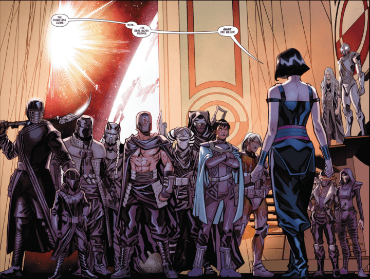 And toward the end of the issue, we get an even fuller look at the strength of Crimson Dawn: not only have they infiltrated the Hutts and the Empire, but they also have the Knights of Ren loyal to them. It sounds like the story of Crimson Dawn is just getting started, even while the story of the War of the Bounty Hunters is ending.