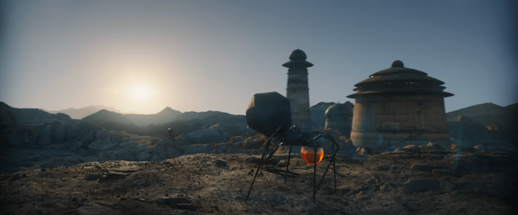 The first shot that we get in the trailer is of Tatooine, as we get a shot of the Dune Sea and Jabba’s Palace, and we see a B’omarr Monk wandering about! That’s what this spider-like droid is, as the B’omarr Monks were a religious group that thought it best to separate their brains from their bodies, so their brains were placed in special containers meant to house them – which were then carried about by these spider-like droids in order to move about. A B’omarrian monastery was located on Tatooine, which was taken over by Jabba – who nonetheless allowed the monks to stay around.