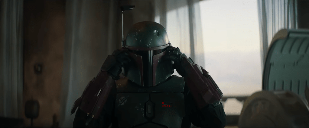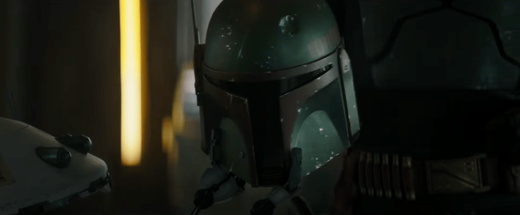Next up is a droid handing Boba his helmet, which he looks at briefly before putting on. As we see this, we hear Boba saying, “I am not a bounty hunter.” We then hear another voice (we’ll get to that in a moment) say, “I’ve heard otherwise.” This statement helps us set the stage a little bit for the show. We all obviously know that Boba Fett is a bounty hunter, and that during the reign of the Empire he was the most notorious in the galaxy. But that was before his experience with the sarlacc pit, and that kind of experience would obviously change a man. As many noted during The Mandalorian season two, this version of Fett’s character does seem a bit different than the one we saw previously, and it seems he’s operating on a bit more nobility and a code. This kind of statement would fit in with that, but I’m also not convinced that it’s this simple. After all, there are some shots in the trailer that still suggest he’s not exactly a good guy, but it does seem like he’s trying to forge ahead as a better person. That could make for some interesting storytelling.