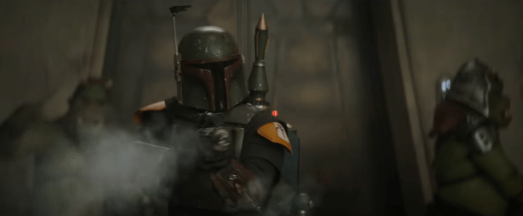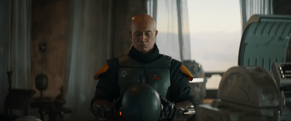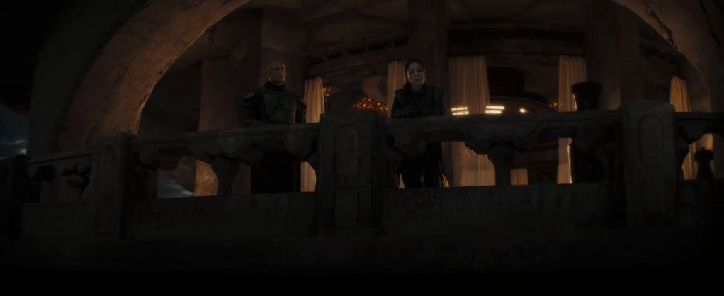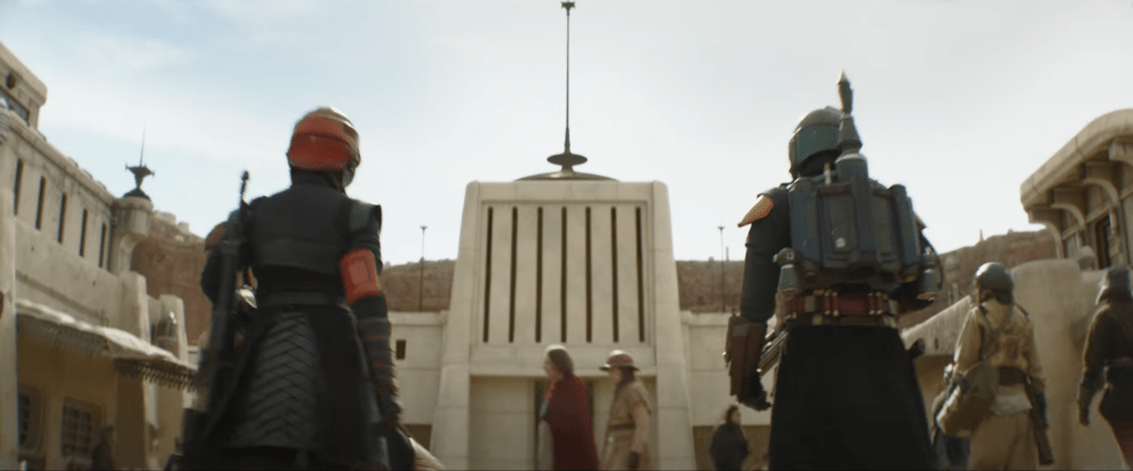As some of these shots are happening, we then see Boba removing his helmet while outside this building, in the streets, with Fennec coming alongside him. And overlaid on all of this is a line from Fett: “Jabba ruled with fear. I intend to rule with respect.” As mentioned earlier, it seems like we’ll be getting a little bit different version of Boba Fett, one who is more respectable and honorable than previously and who intends to do things differently than Jabba did. This does make sense to me, as when we consider what happens in the War of the Bounty Hunters and in Return of the Jedi, it does make sense why Fett would want to do some things differently than his predecessor! I can’t imagine that Jabba is Boba’s favorite person. The version of Fett that we saw in The Mandalorian honored the code and was loyal and respectable. I’m guessing we’ll see his continued development and growth along those lines in this series.