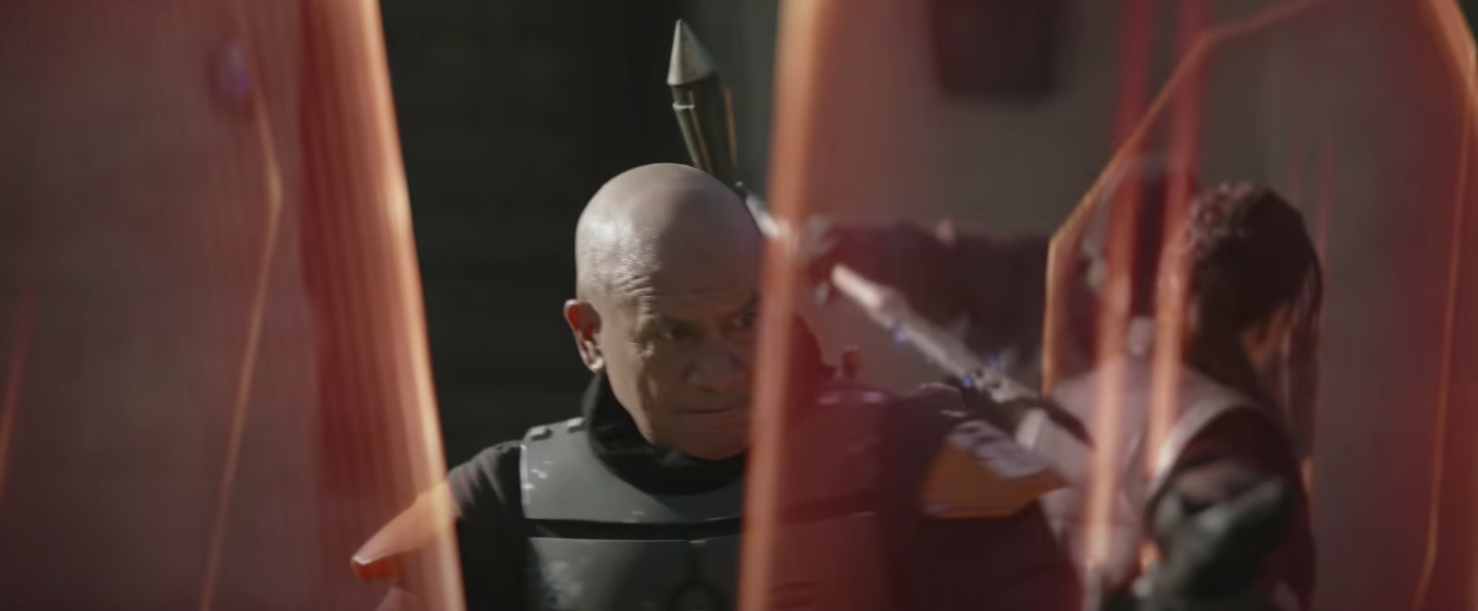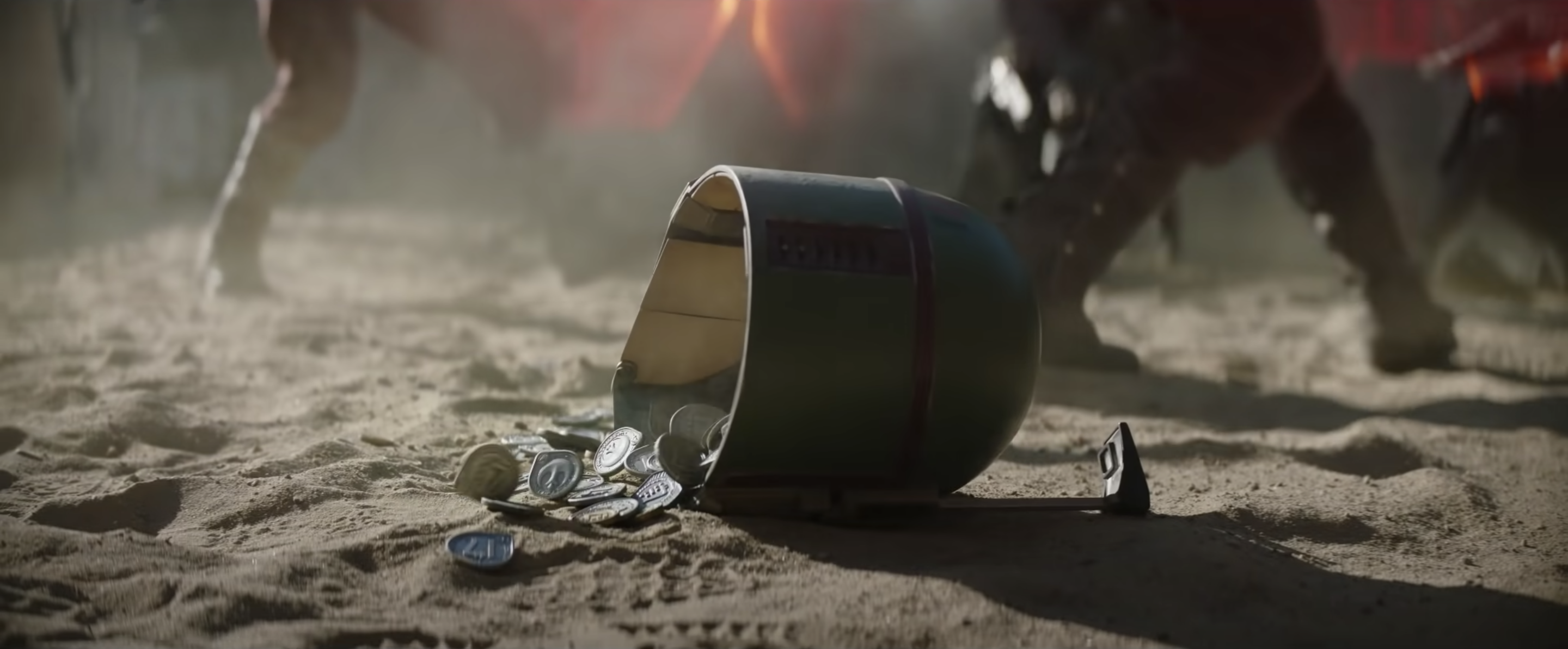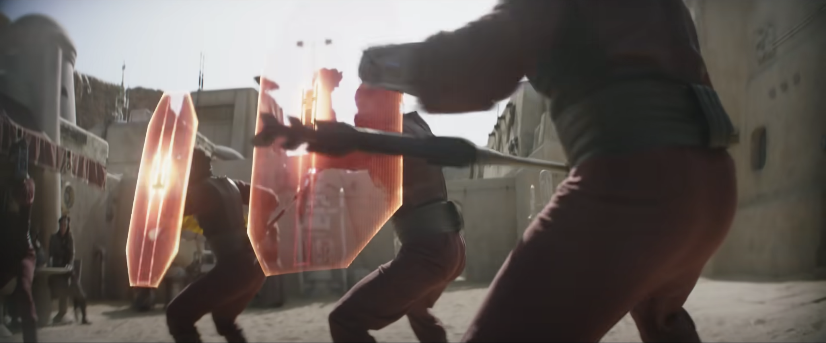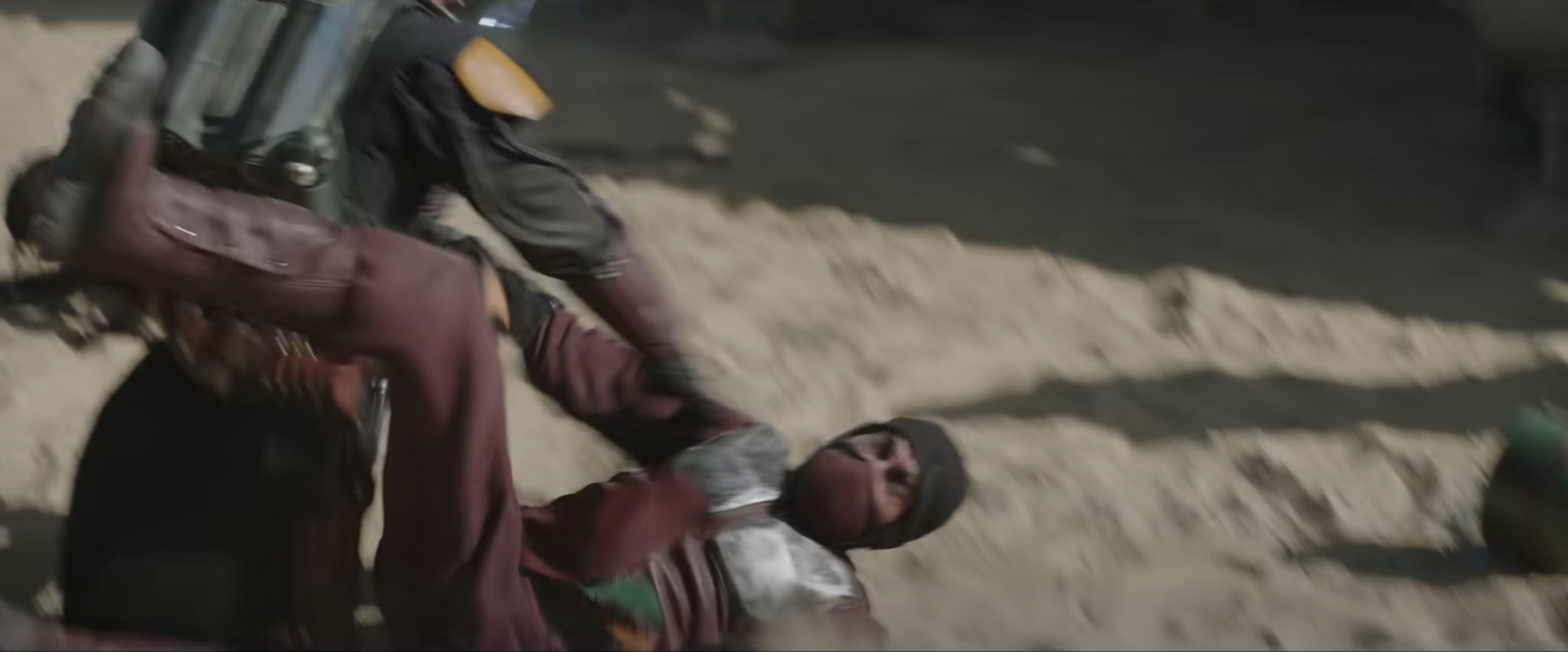I’ve included a number of different shots here, which all appear to be from the same scene – and appear to take place at the same location Fett and Fennec visited earlier. (Which, by the way, given its immense prominence in this trailer makes me think that this will probably occur very early in the season, perhaps even in the first episode.) A number of fighters use shields to surround Boba and Fennec, but Boba springs into action, taking some of them out and then using one of their vibro-staffs to brutally kill one of them (presumably). And in all of this, I think there are three main takeaways that I have. (1) First, it reinforces the point from the previous shots at the dinner: things aren’t exactly going to come easy to Boba in his quest to unite some of the criminal underworld. (2) Second, the shot of Fett’s helmet falling to the ground, and then seeing credits spill out of it, suggests to me that his motives aren’t as good as one might like. He still is probably motivated by greed and making money (which I already suggested earlier he probably assumes he can do better through cooperation than conflict), and this shot further indicates that. It is also worth noting that these are New Republic credits, so perhaps the New Republic has more of a presence on Tatooine than we thought? (3) And third, Fett’s facial expressions while (presumably) killing one of the fighters is one of rage, like we saw in The Mandalorian season two. I do very much think that the character will continue to progress more and more toward a sense of nobility, but we’ve got to keep in mind that he’s a scoundrel; he’s not exactly a good guy in the Star Wars universe. I’m guessing we’ll get a chance to see some of this progression and development happen in the course of the show.