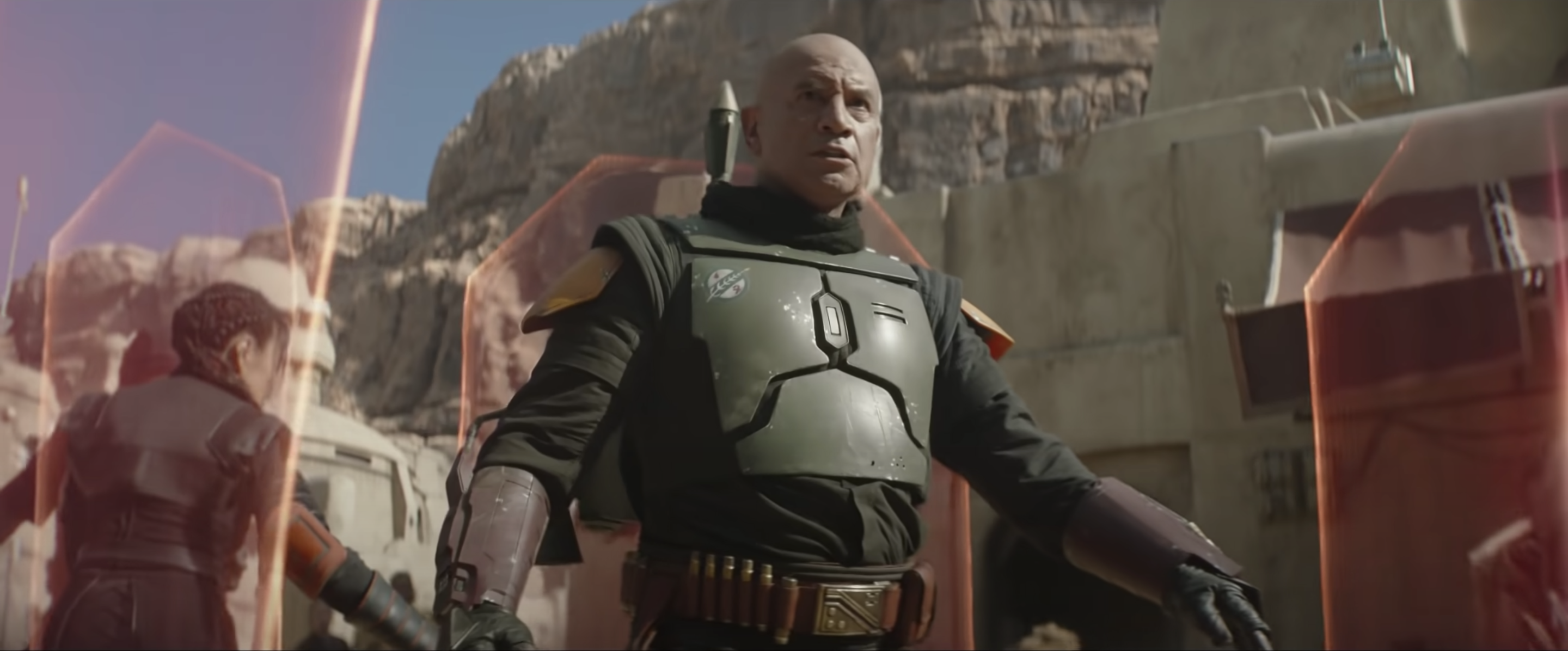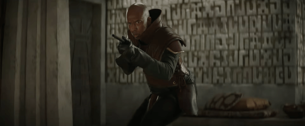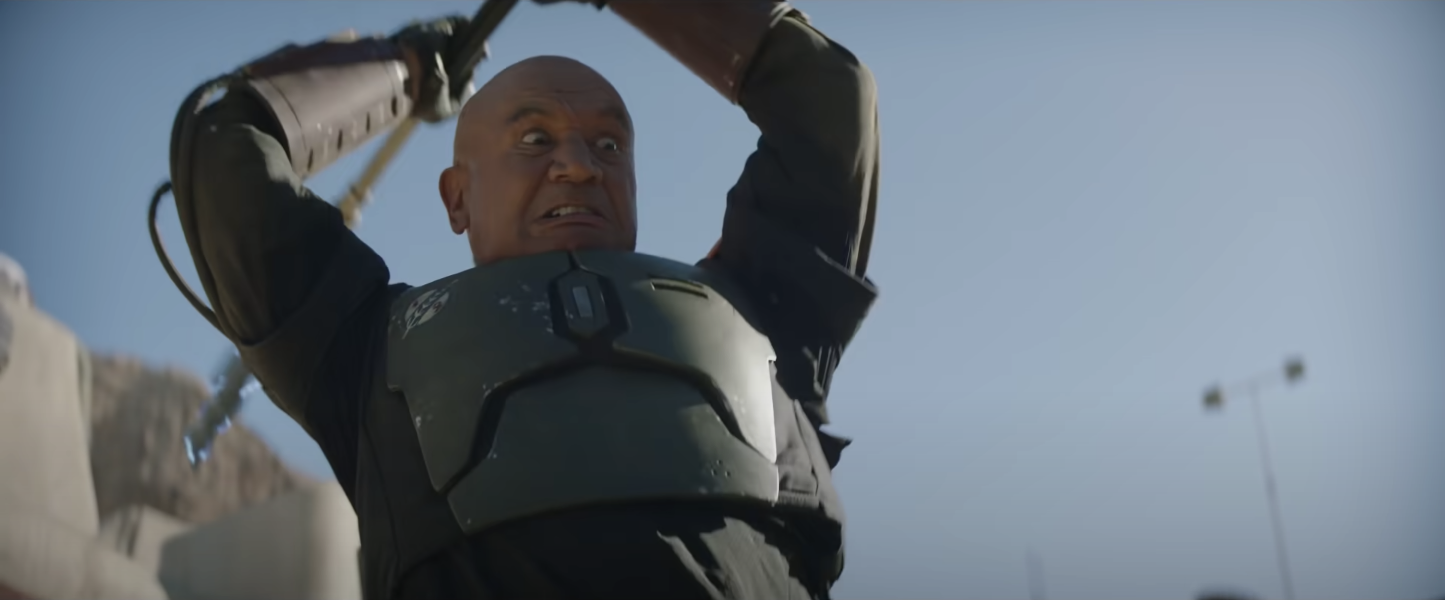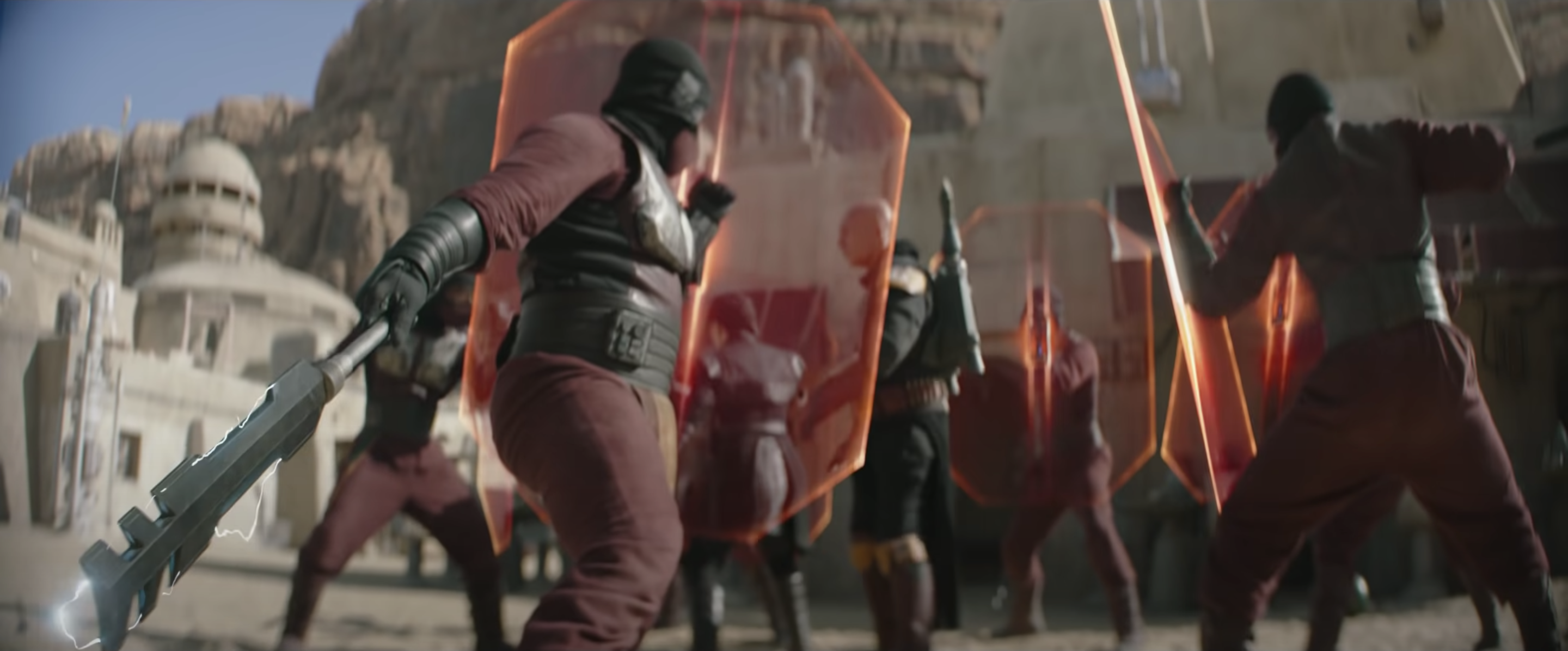 I’ve included a number of different shots here, which all appear to be from the same scene – and appear to take place at the same location Fett and Fennec visited earlier. (Which, by the way, given its immense prominence in this trailer makes me think that this will probably occur very early in the season, perhaps even in the first episode.) A number of fighters use shields to surround Boba and Fennec, but Boba springs into action, taking some of them out and then using one of their vibro-staffs to brutally kill one of them (presumably). And in all of this, I think there are three main takeaways that I have. (1) First, it reinforces the point from the previous shots at the dinner: things aren’t exactly going to come easy to Boba in his quest to unite some of the criminal underworld. (2) Second, the shot of Fett’s helmet falling to the ground, and then seeing credits spill out of it, suggests to me that his motives aren’t as good as one might like. He still is probably motivated by greed and making money (which I already suggested earlier he probably assumes he can do better through cooperation than conflict), and this shot further indicates that. It is also worth noting that these are New Republic credits, so perhaps the New Republic has more of a presence on Tatooine than we thought? (3) And third, Fett’s facial expressions while (presumably) killing one of the fighters is one of rage, like we saw in The Mandalorian season two. I do very much think that the character will continue to progress more and more toward a sense of nobility, but we’ve got to keep in mind that he’s a scoundrel; he’s not exactly a good guy in the Star Wars universe. I’m guessing we’ll get a chance to see some of this progression and development happen in the course of the show.