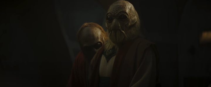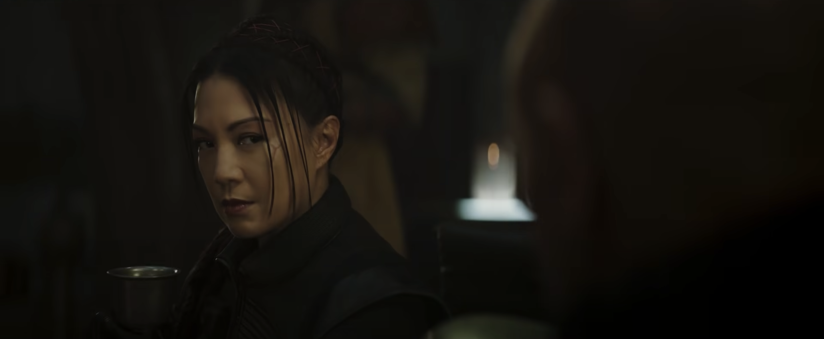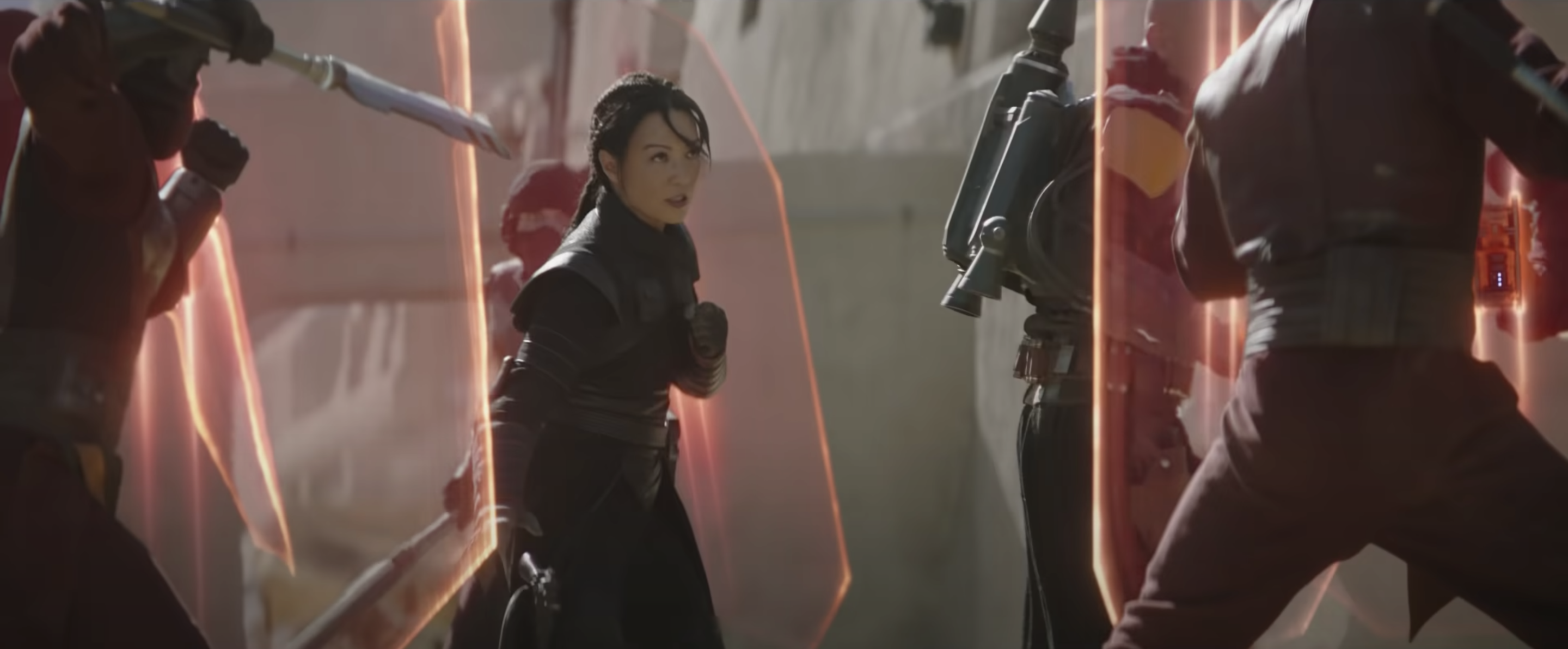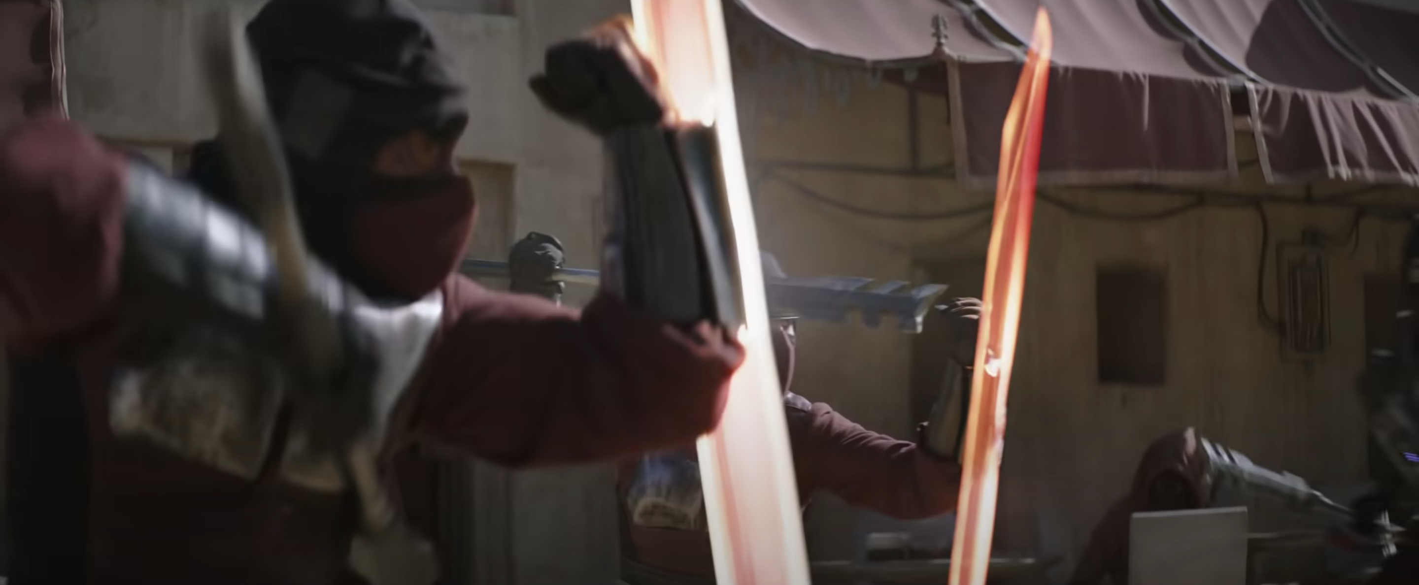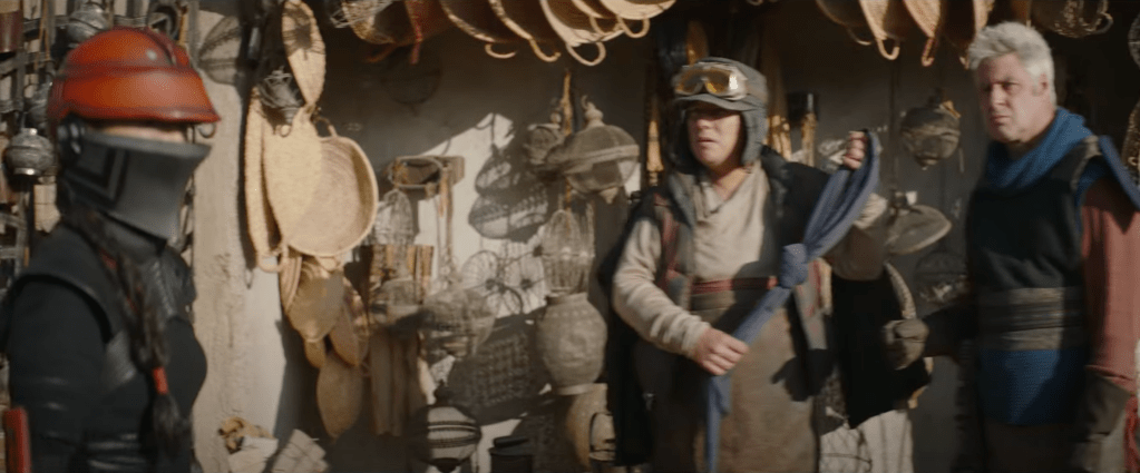 I’ve included a number of different shots here, which all appear to be from the same scene – and appear to take place at the same location Fett and Fennec visited earlier. (Which, by the way, given its immense prominence in this trailer makes me think that this will probably occur very early in the season, perhaps even in the first episode.) A number of fighters use shields to surround Boba and Fennec, but Boba springs into action, taking some of them out and then using one of their vibro-staffs to brutally kill one of them (presumably). And in all of this, I think there are three main takeaways that I have. (1) First, it reinforces the point from the previous shots at the dinner: things aren’t exactly going to come easy to Boba in his quest to unite some of the criminal underworld. (2) Second, the shot of Fett’s helmet falling to the ground, and then seeing credits spill out of it, suggests to me that his motives aren’t as good as one might like. He still is probably motivated by greed and making money (which I already suggested earlier he probably assumes he can do better through cooperation than conflict), and this shot further indicates that. It is also worth noting that these are New Republic credits, so perhaps the New Republic has more of a presence on Tatooine than we thought? (3) And third, Fett’s facial expressions while (presumably) killing one of the fighters is one of rage, like we saw in The Mandalorian season two. I do very much think that the character will continue to progress more and more toward a sense of nobility, but we’ve got to keep in mind that he’s a scoundrel; he’s not exactly a good guy in the Star Wars universe. I’m guessing we’ll get a chance to see some of this progression and development happen in the course of the show.