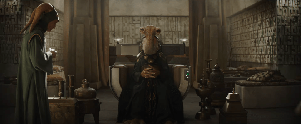 We see who it is they are going to visit (presumably), and we learn that it’s the same person who we heard speaking earlier questioning Fett’s assertion that he’s not a bounty hunter. It’s an Ithorian, and he’s obviously important, as he sits on a throne, has attendants around him, and is visited by Boba Fett. This Ithorian says, “I know that you sit on the throne of your former employer.” We don’t know who this Ithorian is; I think it would be cool if Dok Ondar were to show up as a cameo at some point, but this certainly doesn’t seem like him, and depending on this guy’s role it might make sense why Dok Ondar wouldn’t be used. We’ll have to wait and see. He’s obviously a person of some significance, and I wonder if he’s one of the people who rose to a place of prominence on Tatooine in the absence of Jabba the Hutt in the five years since Return of the Jedi.