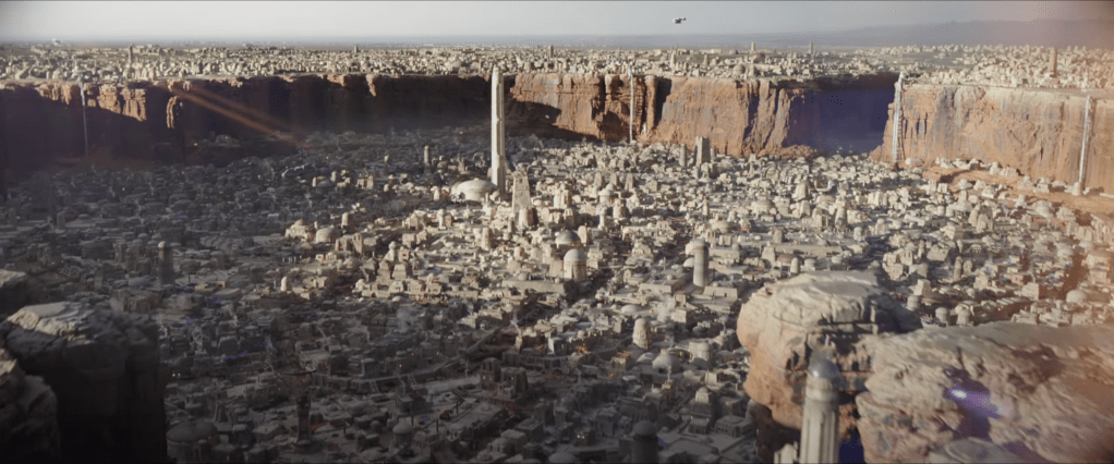 And the reason I speculate that he’s on Tatooine is because this city looks like it’s probably the same one Fett and Shand visit the Ithorian in. I love the design of this city, as it’s this sprawling metropolis built into a vast cavern. It evokes memories of Jedha in my mind, but I think it’s probably Tatooine. I think that given the fact that this is on a desert planet, that it looks like most of what we see in the trailer is on Tatooine, and that Fett is operating from that world. And in a show that appears to be heavily set on one of the most familiar planets in Star Wars, it makes a ton of sense to show us a city on the planet we’ve never seen before. This would be without question the largest city we’ve encountered on the planet, and so I wonder if it could be a city like Bestine – one that we know exists but have never actually seen.