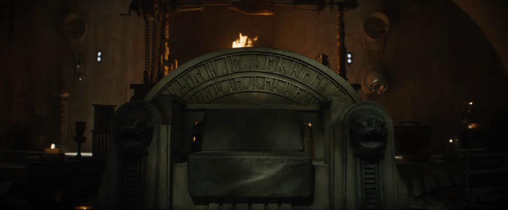We get a shot of Boba Fett’s throne, the one that Bib Fortuna previously sat on before Fett killed him and took it himself. And Alex Damon at Star Wars Explained actually translated this: it’s written in the ancient Sith tongue, ur-Kittât, and roughly reads “Boba Fett.” That’s a fun easter egg, but don’t make too much of it. It’s unlikely there’s actually a reason why the throne that was there before Fett ever sat on it would bear his name, but it’s a fun easter egg for fans. I think that’s probably all it is, and that’s fine! It’s fun.