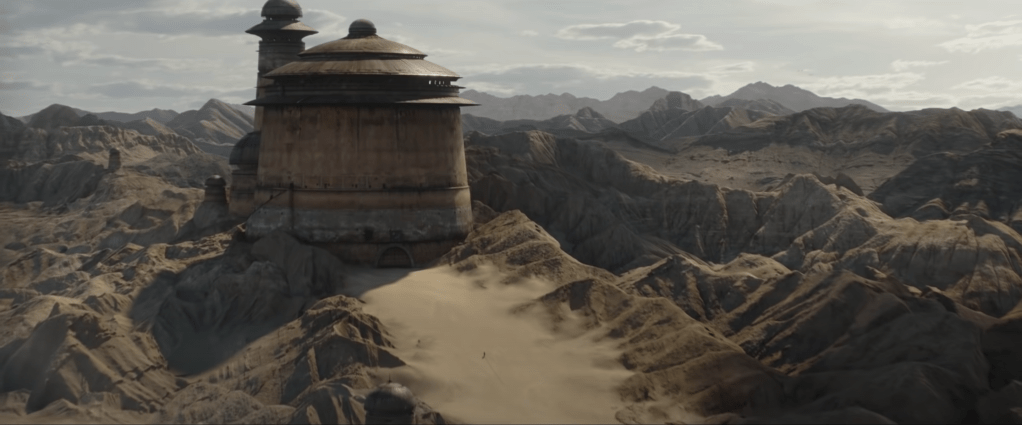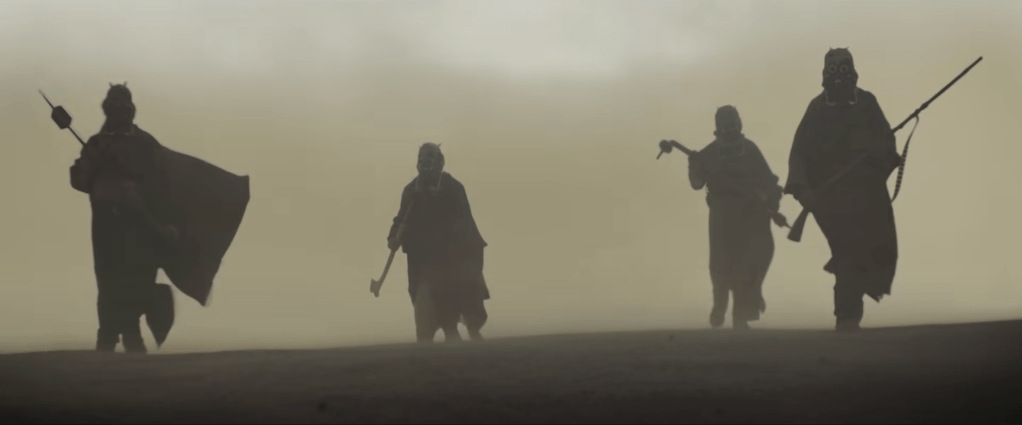 There’s a shot of Tusken Raiders forging through a sandstorm, which is obviously a shot that will evoke familiar images for Star Wars fans and connect instantly in the trailer. But I also find their outfits interesting; it’s possible that the colors are merely deceiving based on this shot, but it looks like their cloaks are dark brown – which look to me just like the cloak Boba Fett wears when we first see him in The Mandalorian season two, before he gets his armor back. And considering he carries a gaffi stick as well, it makes sense. In other words, I wonder if this could be a flashback scene of the Tusken Raiders who found Boba Fett after his survival from the sarlacc pit? We know that Jawas found his armor, but they presumably didn’t have anything to do with Fett himself (either just finding his armor, or presuming him dead). So maybe it was Tusken Raiders who actually helped him recover? The only reason I speculate on this is because of Fett’s dress and weaponry in The Mandalorian, and these sand people in this shot look very similar. Regardless of whether I’m right here, I hope we do get some flashbacks and some exploration of how Fett managed to survive.