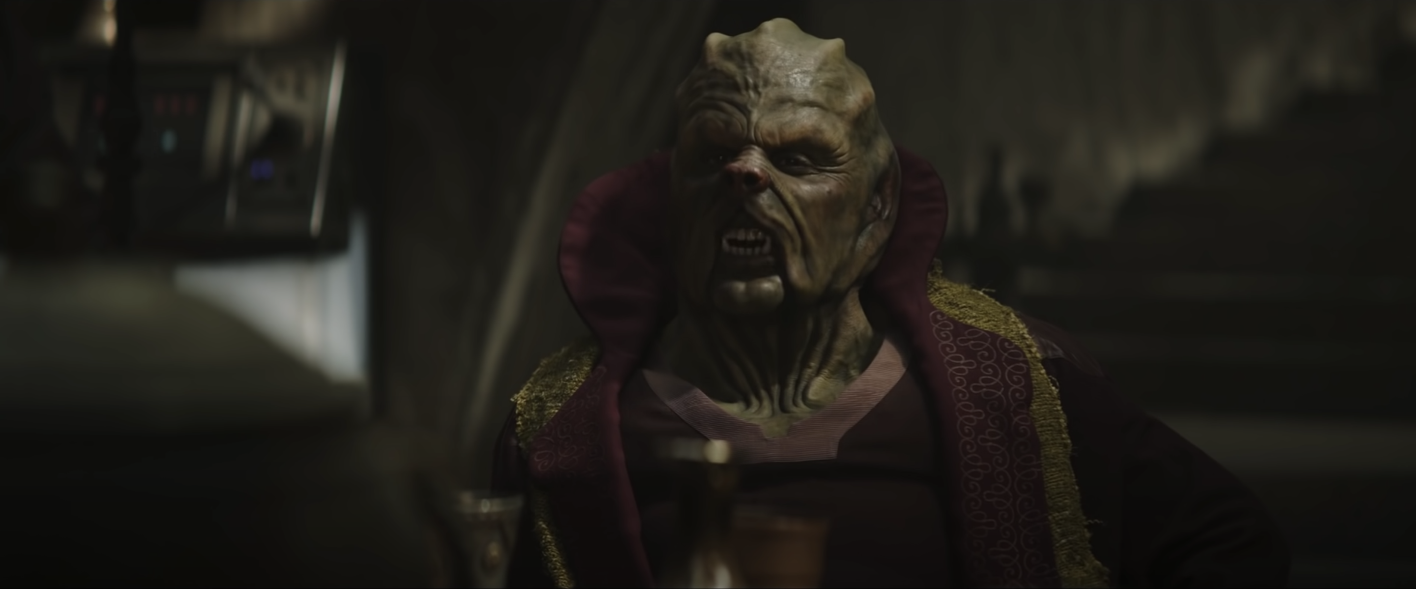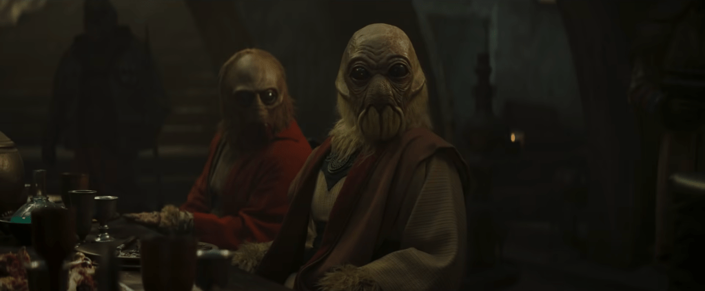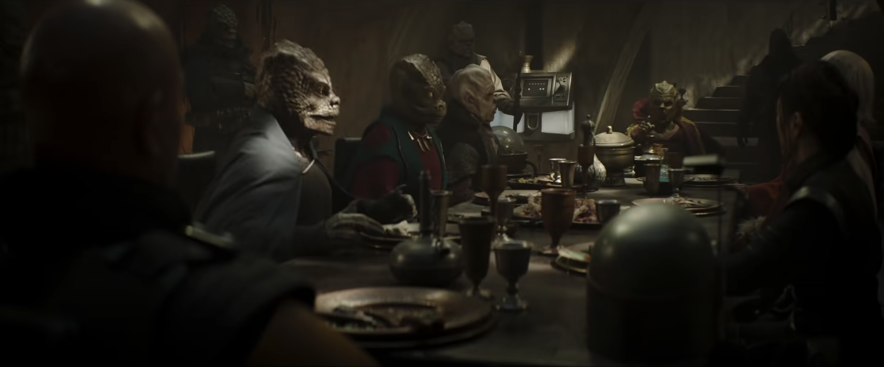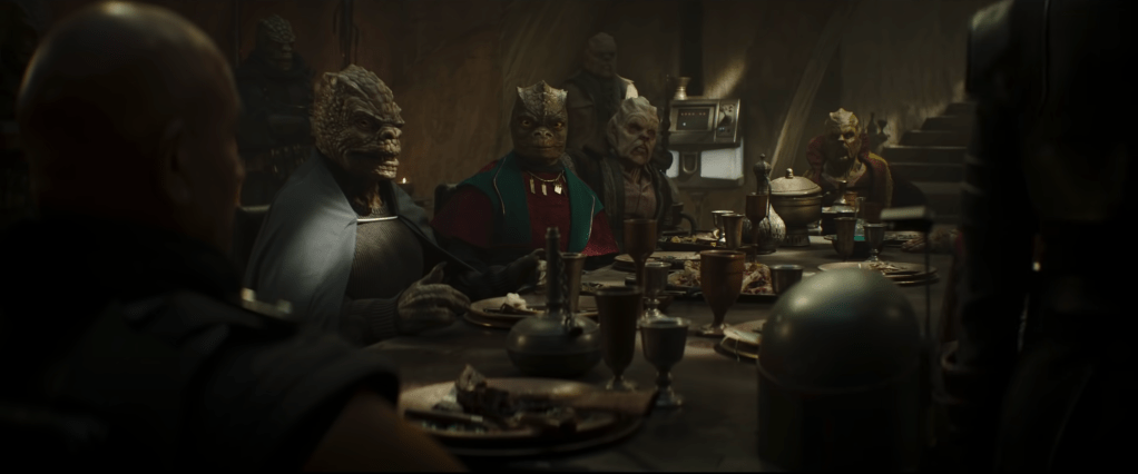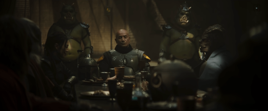 This is a very interesting shot of Boba Fett sitting at a banquet table in Jabba’s Palace with a number of others, including some Trandoshans, some Klatooinians, some Aqualishes, and probably others too. Fennec Shand tells them, “You were all once captains under Jabba the Hutt,” which gives us an idea of who Boba is speaking to. These are people who worked for Jabba, and were some of his ‘trusted’ men. But rather than coming to them to enact revenge, Fett comes to them with a job offer, apparently. “I’m here to make a proposal that’s mutually beneficial,” he says. “Why speak of conflict when cooperation can make us all rich?” So Boba’s aim is still to get rich, but he seems to think there’s a better way of doing it than fighting against each other. The crime syndicates in Star Wars have mostly been marked by conflict, with rare exceptions of cooperation like Maul’s Shadow Collective. I would be very interested to see Fett trying to work with others rather than against them. I think that would be pretty cool. But it wouldn’t be for some noble reason of wanting to unite people, but rather still out of greed and a desire for riches – he just thinks there’s a better way of getting it.